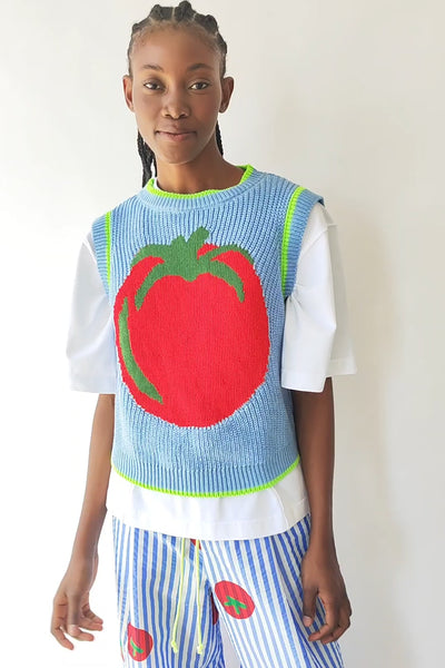 Un gilet qui ne passe pas inaperçu. Avec une grande tomate en vedette sur un fond bleu doux, ce vêtement est une véritable déclaration d'amour à la couleur et à l'humour méditerranéen. Les finitions en vert lime au col, aux emmanchures et à l'ourlet apportent un contraste frais et vibrant qui le rend encore plus spécial.